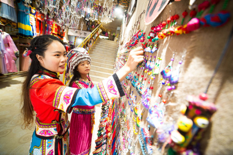 ↑7月4日,在貴州省畢節市大方縣奢香古鎮聚民藝彝族文化服飾店,龍恩碧(左)在整理店內服飾。