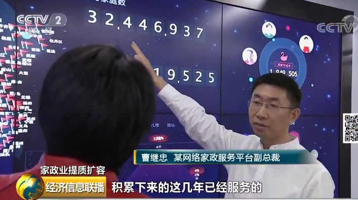 某網絡家政服務平臺副總裁 曹繼忠:整個到家勞動者的數量現在是1949000人,這邊是我們這些年累積下來這幾年服務的家庭數量,3200萬,能滿足的需求大概不到30%,有巨大的缺口。