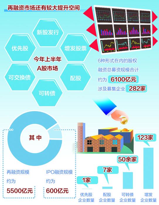 問題三:盡管與并購重組密切聯(lián)系的再融資市場也在回暖,但總體融資規(guī)模仍有很大潛力可挖。Wind資訊統(tǒng)計顯示,今年上半年,A股市場包含新股發(fā)行(IPO)、增發(fā)股票、配股、可轉(zhuǎn)債、可交換債、優(yōu)先股等6種形式在內(nèi)的股權(quán)融資總募資規(guī)模合計約為6100億元,涉及募集企業(yè)數(shù)量282家。其中,再融資規(guī)模約為5500億元,IPO融資規(guī)模約為600億元。增發(fā)企業(yè)數(shù)量有123家,配股企業(yè)數(shù)量有7家,優(yōu)先股企業(yè)數(shù)量有1家,可轉(zhuǎn)債企業(yè)數(shù)量有50余家。與龐大的銀行信貸規(guī)模相比,再融資市場規(guī)模還有較大提升空間。