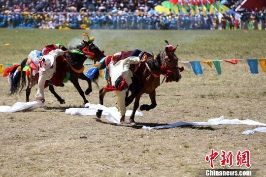 圖為玉樹傳統賽馬節暨雪域格薩爾文化藝術節和三江源水文化節開幕式現場馬上拾哈達展示。 羅云鵬 攝