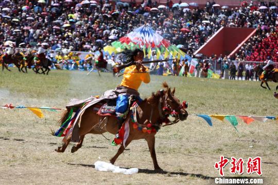 圖為玉樹傳統賽馬節暨雪域格薩爾文化藝術節和三江源水文化節開幕式現場馬上火槍展示。 羅云鵬 攝