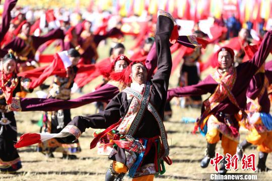 圖為玉樹傳統賽馬節暨雪域格薩爾文化藝術節和三江源水文化節開幕式現場伊舞展示。 羅云鵬 攝