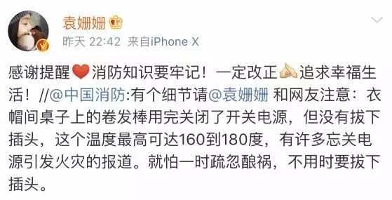 有個細節(jié)請@袁姍姍和網(wǎng)友注意:衣帽間桌子上的卷發(fā)棒用完關(guān)閉了開關(guān)電源,但沒有拔下插頭,這個溫度最高可達160到180度,有許多忘關(guān)電源引發(fā)火災(zāi)的報道。就怕一時疏忽釀禍,不用時要拔下插頭。