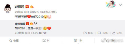 今天,馮紹峰微博宣布趙麗穎懷孕:“知否知否,應(yīng)是一家三口”。趙麗穎也轉(zhuǎn)發(fā)微博表示“等候等候,恭迎2019。”二人夫唱婦隨,合轍押韻。