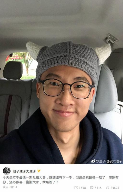 1月7日凌晨,《吐槽大會》常駐嘉賓池子發(fā)文寫道“今天是本季最后一期吐槽大會,應(yīng)該還有下一季,但這是我最后一期了,感謝有你,滿心歡喜,謝謝大家,我是池子! ”宣布將退出節(jié)目。