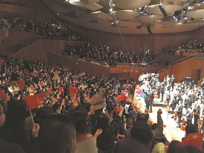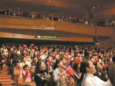當壓軸登場的《我和我的祖國》的旋律響起,所有觀眾起立,揮舞著音樂廳準備的國旗齊聲放歌。