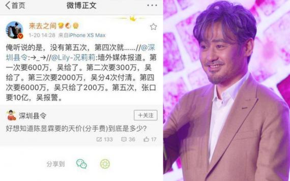 20日下午,有網友爆料稱陳昱霖向多次向吳秀波索要分手費,第1次要了600萬,第2次要了300萬,第3次要2000萬,吳秀波哪怕分期付款都一一付清了,而陳昱霖第4次要6000萬,吳秀波只給了200萬,第5次,更是獅子大開口要10個億,因此才逼得吳秀波報警。