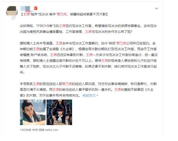 據悉,有知情人向知名大V透露,王源在去年與范冰冰工作室解約,如今“轉投”賈乃亮公司并已經簽約。爆料稱,在去年解約前,王源拍攝了古裝劇《大主宰》,根據合同片酬分期先打到范冰冰工作室,但由于工作室被稽查賬戶被凍結,王源遲遲沒有拿到片酬,王源一方多次與范冰冰工作室協商追討,但一直沒有結果,據知情人士透露這筆片酬估計在千萬以上。更有消息傳出王源的母親訴苦稱兒子的血汗錢替人交了稅款,范冰冰欠兒子片酬不還等等,如果還拿不到片酬,她們將對范冰冰工作室進行起訴。