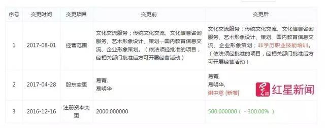 通過天眼查紅星新聞記者發(fā)現(xiàn),該校創(chuàng)始人易菁名下?lián)碛?家公司,除徐州市華夏學宮文化發(fā)展有限公司外,其余3家均為不同的文化有限公司,而徐州市華夏學宮文化發(fā)展有限公司還占股5家公司,分別涉及物業(yè)管理、商貿(mào)、旅游咨詢、文化傳播和餐飲管理。同時,紅星新聞記者注意到,徐州市華夏學宮文化發(fā)展有限公司的經(jīng)營范圍是在2017年8月1日之后,方才新增“非學歷職業(yè)技能培訓”一項,此前的公司經(jīng)營范圍當中,涵蓋的經(jīng)營范圍主要為文化交流服務、藝術(shù)形象設計等方面。