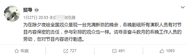 春晚導演呼吁不要劇透,稱“春晚劇組所有演職人員有對節目內容保密的責任,參與彩排的觀眾也一樣。”