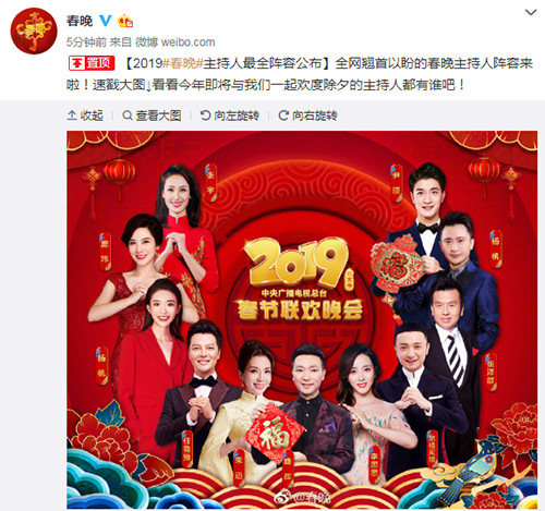 人民網北京1月31日電(記者 吳亞雄)今日,2019年央視春晚發布消息,公布主持人陣容。其中康輝、朱迅、任魯豫、李思思、尼格買提將擔任北京主會場主持人。另外,今年春晚還將設立三個分會場:江西井岡山分會場將由中央廣播電視總臺主持人張宇和江西廣播電視臺主持人尹頌合作主持;吉林長春分會場將由中央廣播電視總臺主持人張澤群與吉林廣播電視臺主持人楊帆聯合主持;廣東深圳分會場將由中央廣播電視總臺主持人楊帆和深圳衛視主持人龐瑋攜手主持。