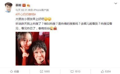 搜狐娛樂訊 日前,蔡明在節目中顯露的“A4腰”好身段引發熱議,2月3日,她曬了一張與迪麗熱巴的合照,并可愛地向網友發問,何為熱搜?她寫道:“大朋友小朋友早上好呀!聽說昨天我上熱搜了?啥叫熱搜?是熱情的搜索嗎?去哪兒能看到?”之后蔡明又補充了一句:“熱搜沒看見,看見熱巴了,春晚后臺?!?/p>