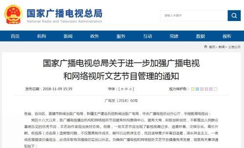 11月9日,國家廣播電視總局發布《關于進一步加強廣播電視和網絡視聽文藝節目管理的通知》,要求堅決遏制追星炒星、泛娛樂化等不良傾向,嚴控片酬,堅決打擊收視率造假行為。