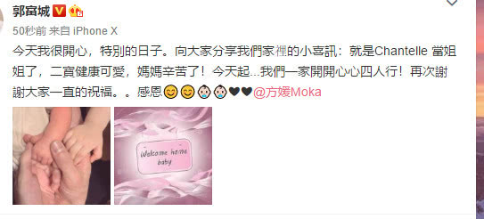 騰訊娛樂訊 4月18日晚,天王郭富城在微博發(fā)文宣布老婆方媛二胎順利生產(chǎn),并配文稱:“是Chantelle 當(dāng)姐姐了,二寶健康可愛,媽媽辛苦了!今天起...我們一家開開心心四人行!再次謝謝大家一直的祝福。。感恩”