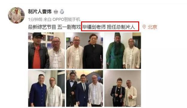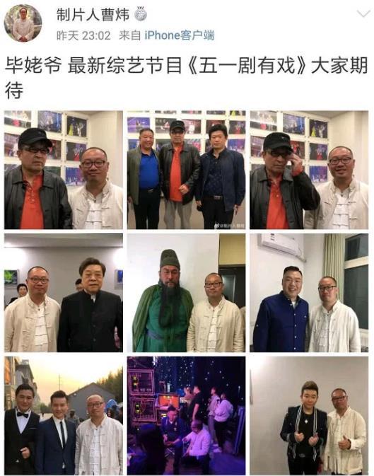4月17日深夜11時許,著名電影制片人、央視《星光大道》評審曹煒在微博上曬出一組照片,與多為知名演員合照組成的九宮格,其中和畢福劍的合影占多數,還配文“畢姥爺最新綜藝節目《五一劇有戲》,大家期待!”雖未大張旗鼓,但也側面官宣了畢福劍復出的消息。