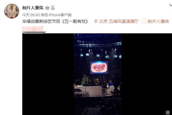 四年前因為發表不當言論,畢福劍隱退消失在大眾視野。而這次復出參與的新節目也類似于之前超高收視率的《五一七天樂》。該制片人也是頻繁更博,曬出工作工作動態,每次都要提及畢福劍的名字,看來畢福劍復出是板上釘釘的事了。在看節目的名字《五一劇有戲》應該是要和大家五一見了。