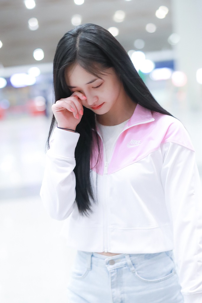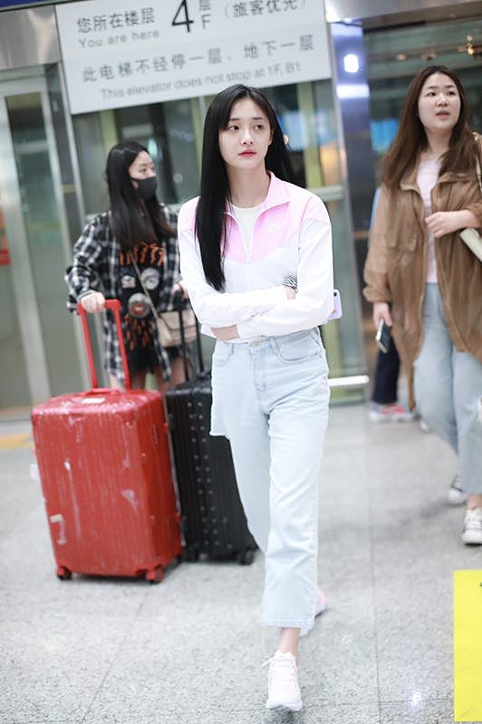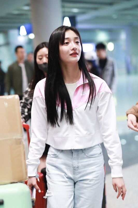 2019年4月29日,周潔瓊現身機場。深夜素顏現身機場的她一身運動裝顯清純,一路不時揉眼睛略顯疲憊,不過見到粉絲后依舊微笑互動努力營業,不愧是愛豆出身。
