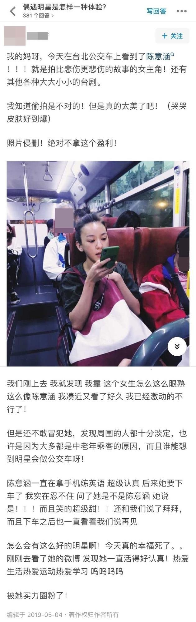 有名網友6日在微博分享偶遇明星的經驗,表示自己一上公車時,就看到了一個很面熟的女生,仔細端詳后確認是陳意涵,“我激動得不行!但是不敢冒犯她”,該網友更表示她途中一直用手機練英語,直到她要下車了,自己才鼓起勇氣詢問,想不到陳意涵也大方承認自己的身份,還親切地說再見,讓該名網友開心不已,更大贊:"被她實力圈粉了!”