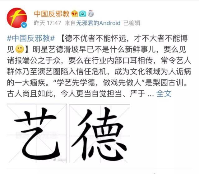 昨天下午,中國反邪教官方微博發文稱:“學藝先學德,做戲先做人”是梨園古訓。古人尚且如此,今人更當自覺擔當、嚴于律己!