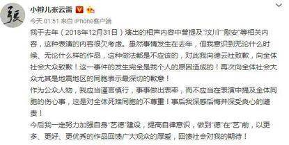 作為公眾人物,我應當謹言慎行,事事做出表率,而不應當在表演中提及全體同胞的傷心事,這是對全體死難同胞的不尊重!事后我深感后悔并深受良心的譴責!