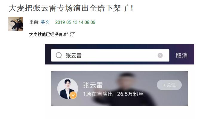 網(wǎng)易娛樂(lè)5月13日?qǐng)?bào)道 日前,張?jiān)评啄勉氪ǖ卣鹱龆汗V乱l(fā)熱議,5月13日,張?jiān)评滓伤茣和8鞣N活動(dòng)的消息接連被爆出。有網(wǎng)友發(fā)文稱(chēng)大麥網(wǎng)已經(jīng)將張?jiān)评讓?zhuān)場(chǎng)演出全部下架,還有爆料稱(chēng)張?jiān)评妆本┱鹃T(mén)票全款退票,更有網(wǎng)友爆料稱(chēng)張?jiān)评椎乃谢顒?dòng)已經(jīng)暫停。有媒體就張?jiān)评籽莩龌顒?dòng)信息為何下架一事咨詢大麥網(wǎng)客服,對(duì)方回應(yīng):“演出票已經(jīng)售罄,所以活動(dòng)信息不顯示了?!?/p>