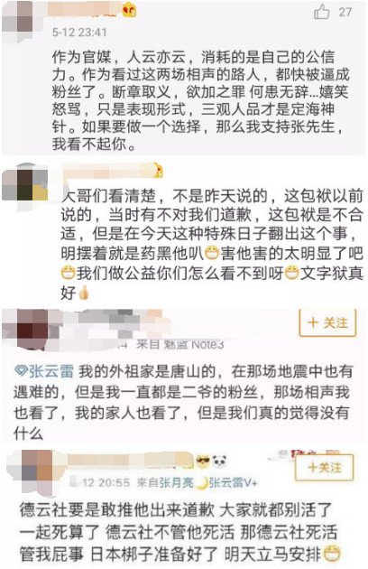 面對這樣的全網(wǎng)性扒皮,張云雷的粉絲似乎沒有領(lǐng)會到張云雷出面道歉是何用意,反而開始擼胳膊挽袖子準備和全網(wǎng)干到底。表面上對大媒體控評低頭認錯,私下里卻全都是“誰惹姆們二爺,姆們就neng死誰”的架勢,這邊diss受災(zāi)群眾賣慘博同情,后悔捐錢;那邊diss網(wǎng)友姆們二爺歉都道了,你憑什么不原諒?