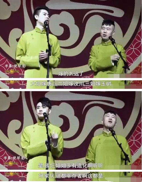 5月12日下午,張云雷被爆出曾經(jīng)在相聲中用地震砸掛,原段是這樣說的:楊九郎(逗哏演員)上面有三個姐姐不常回來。因為嫁得太遠,大姐嫁唐山、二姐嫁汶川,三姐嫁玉樹。楊九郎回道:是,我這仨姐姐多有造化啊聽聽,這都是幸存者啊。