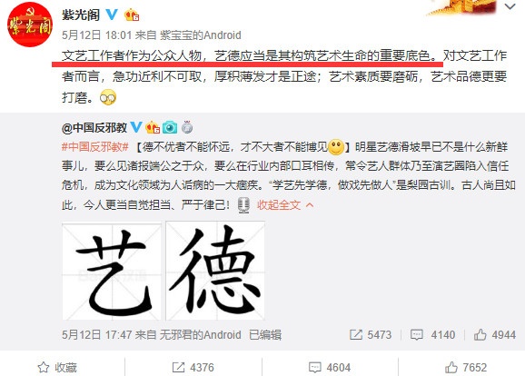 如此無德無三觀的說辭和控評再度激起了網(wǎng)友的憤怒,所以沒多久之后這件事就鬧大了。等到當天下午18點左右,張云雷喜提包括紫光閣、環(huán)球時報、中國反邪教等媒體的隔空批評。盡管大多數(shù)沒有點名,但這樣排隊表明態(tài)度也足以說明予此事的重視程度。