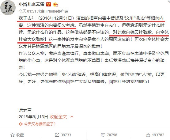 5月13日凌晨兩點左右張云雷上線發(fā)出了一篇道歉聲明亮明態(tài)度,說這是自己在去年的表演,內(nèi)容欠考慮,為此向德云社和全體社會大眾致歉: