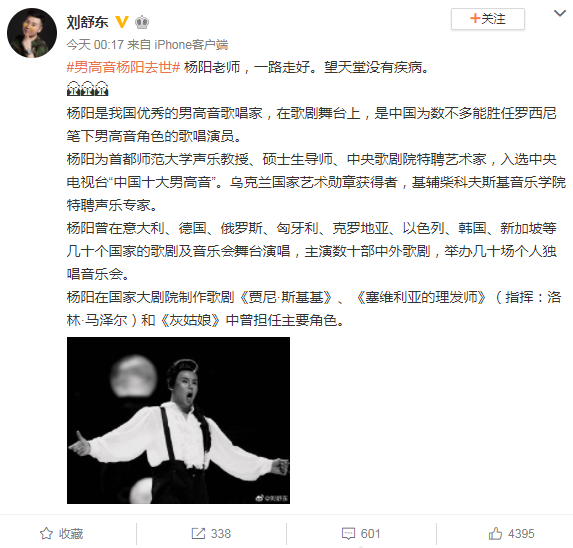 網(wǎng)易娛樂6月11日報道 據(jù)多個消息源,6月10日下午13時左右,我國著名男高音歌唱家楊陽因病不幸離世。