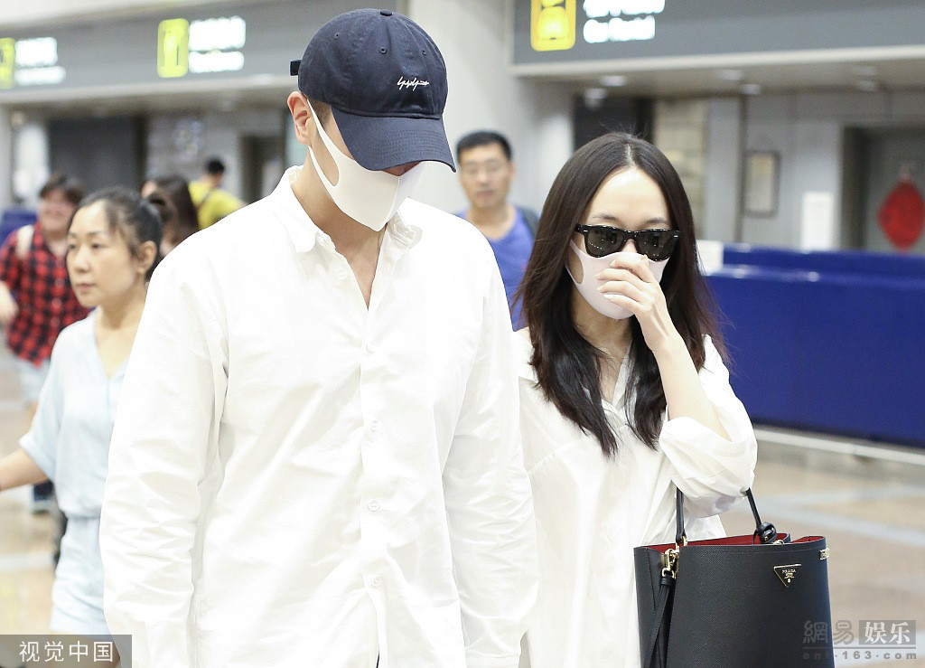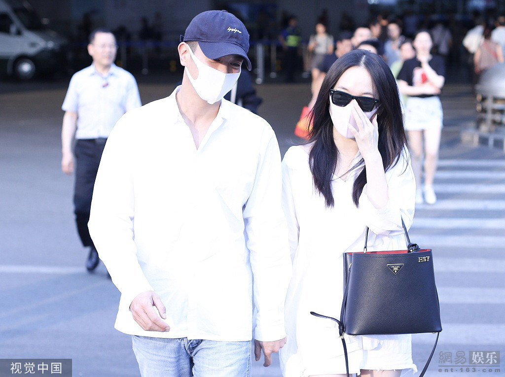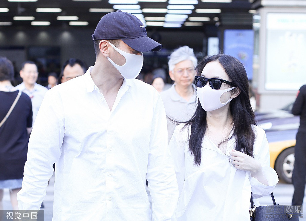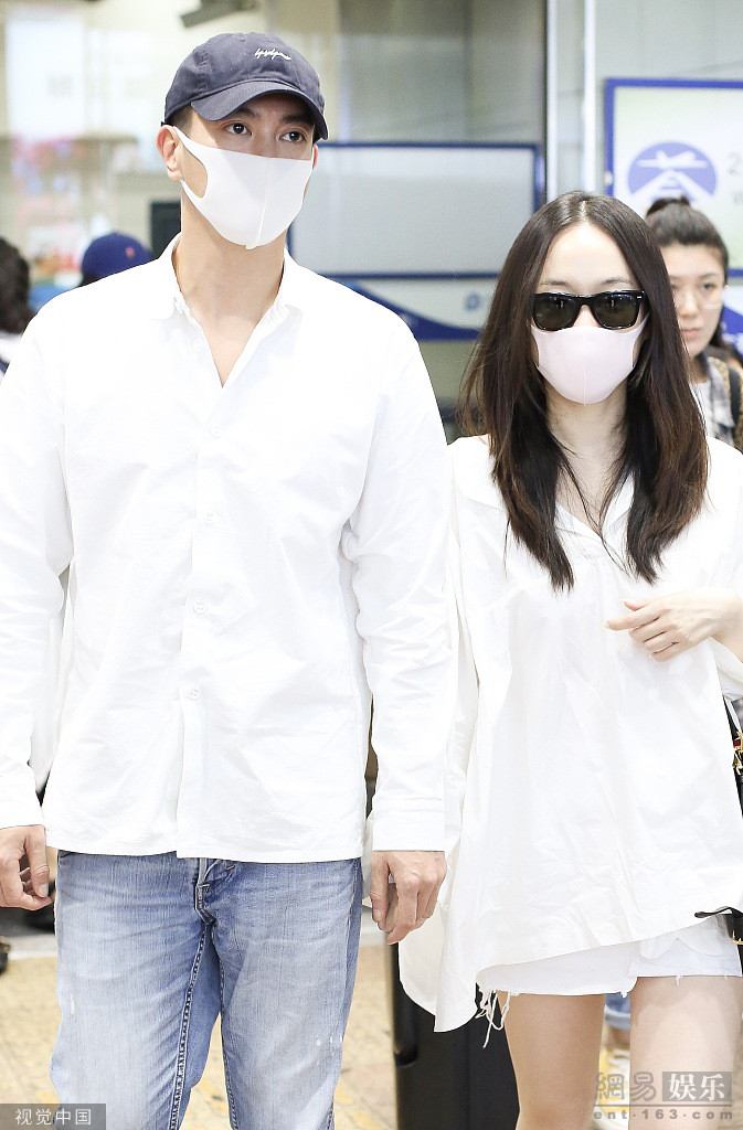 2019年6月20日,北京,杜江、霍思燕夫婦現身機場。兩人戴同款口罩,同穿白色襯衫,情侶風亮相男帥女美配一臉。杜江休閑look帥氣有型,霍思燕露香肩秀美腿女人味十足,夫妻倆全程十指相扣,還不時恩愛對視,互動甜蜜似熱戀。