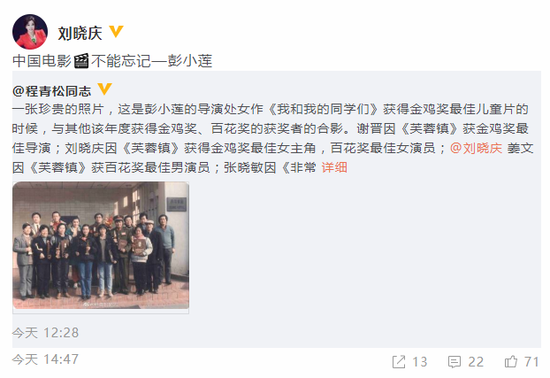 網易娛樂6月26日報道 6月26日,導演、電影編劇程青松曬出了一張關于彭小蓮導演的珍貴照片,并配文追憶:“這是彭小蓮的導演處女作《我和我的同學們》獲得金雞獎最佳兒童片的時候,與其他該年度獲得金雞獎、百花獎的獲獎者的合影。謝晉因《芙蓉鎮》獲金雞獎最佳導演;劉曉慶因《芙蓉鎮》獲得金雞獎最佳女主角,百花獎最佳女演員;姜文因《芙蓉鎮》獲百花獎最佳男演員;張曉敏因《非常大總統》獲百花獎最佳女配角;徐寧因《芙蓉鎮》獲金雞獎最佳女配角;祝士彬因《芙蓉鎮》獲百花獎最佳男配角。這張照片是上海電影制片廠的獲獎代表合影。這一年上影是獲獎大戶。”隨后,劉曉慶轉發程青松的該條微博,并配文“中國電影不能忘記—彭小蓮”,以表對彭小蓮的緬懷。