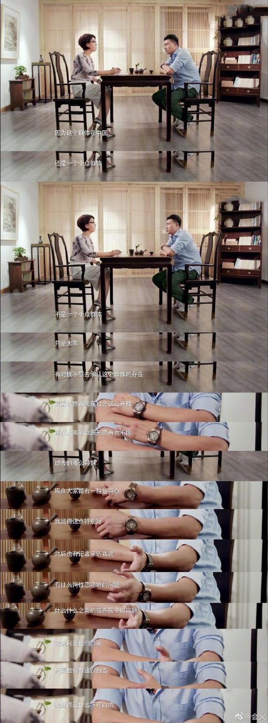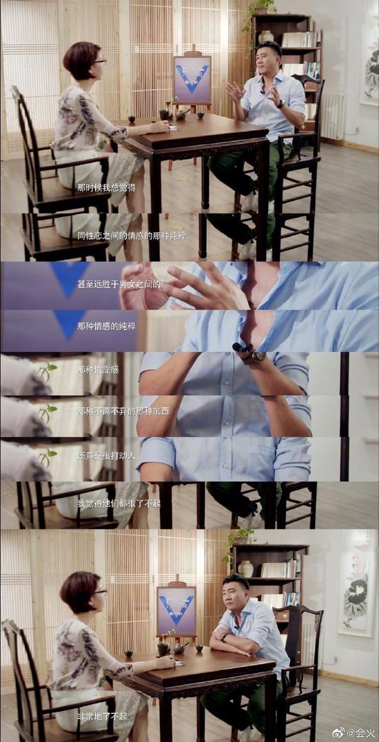 胡軍在訪談里談到同性戀群體,他覺得同性之間純粹的感情,甚至遠勝男女。只要他們愿意,有這份擔當,沒什么不可以。