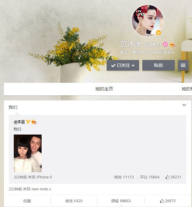 2015年5月29日上午,李晨在微博上曬出與范冰冰的甜蜜合影,并配文:“我們”,隨后范冰冰轉發李晨合影,同樣附文:“我們”,承認了兩人正在熱戀中。