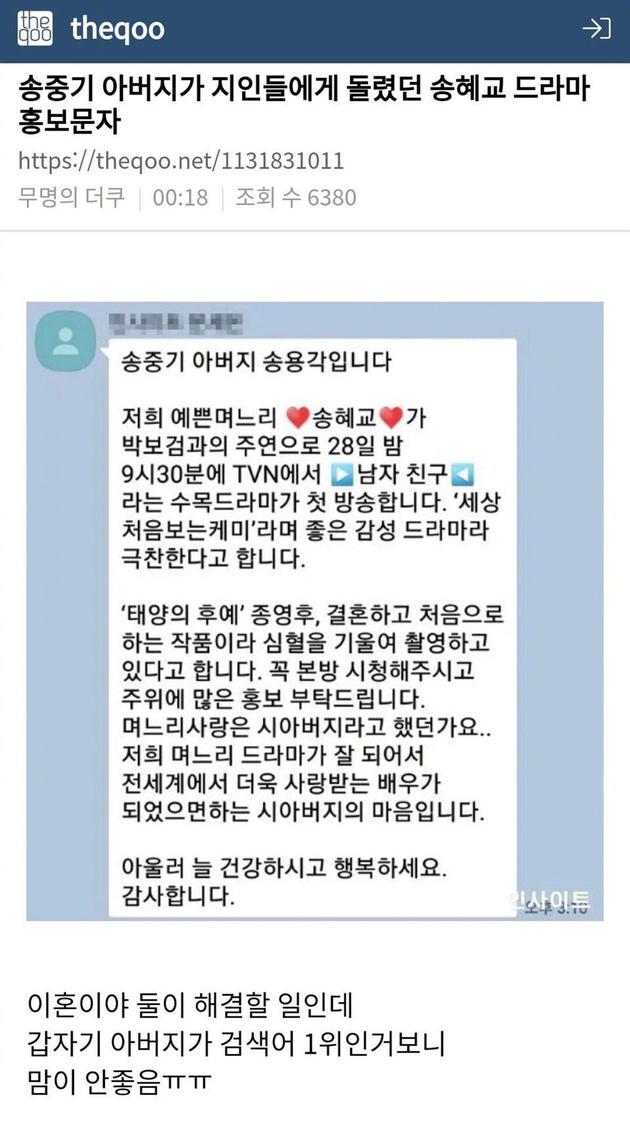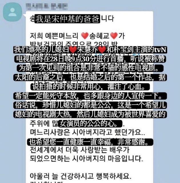 在短信中,宋仲基爸爸說這是宋慧喬《太陽的后裔》之后也是結婚后的第一個作品,拍攝時非常用心,用了很多心血,并希望記者“多跟身邊的人宣傳一下”,最后還配文“俗話說珍惜兒媳婦的都是公公,這是一個希望兒媳婦的電視劇大熱,然后兒媳婦成為被全世界喜愛的女演員的公公的心?!?/p>