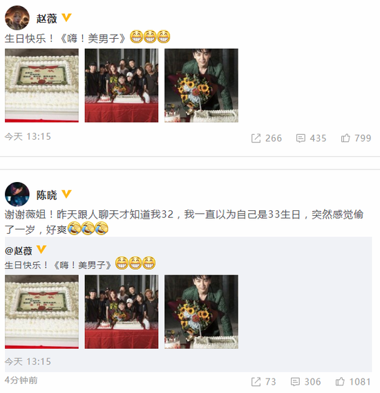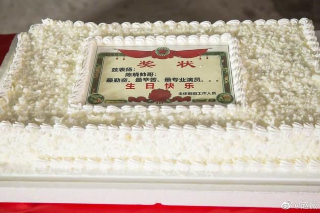 網易娛樂7月5日報道 7月5日,趙薇在微博曬出了在其監制的新片片場為陳曉慶生的照片,并配文“生日快樂!《嗨!美男子》。”照片中,陳曉手捧向日葵,帥氣十足。給陳曉準備的蛋糕上,寫著“茲表揚:陳曉帥哥,最勤奮、最辛苦、最專業演員。”而趙薇的配文中,也曝光了其監制新片的片名為《嗨!美男子》。隨后,陳曉轉發趙薇微博表示感謝:“謝謝薇姐!昨天跟人聊天才知道我32,我一直以為自己是33生日,突然感覺偷了一歲,好爽。”