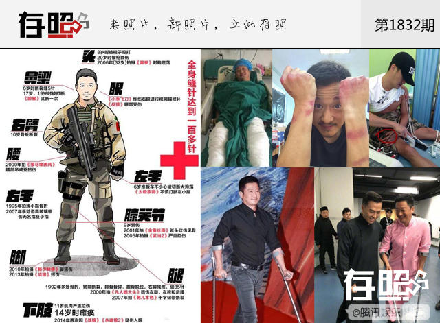 【吳京曾斷手指、炸傷眼、腦震蕩】從名不經傳的功夫小子,到小有名氣的功夫明星,再到《戰狼2》56億票房的新晉導演,吳京在武打演員的路上走了近23年。這些年,據不完全統計,吳京拍戲受傷多達100余次,一點不比成龍大哥少。少時練武癱瘓過;拍《太極宗師》時曾被打斷手指;《小李飛刀》中又被炸傷右眼;《黑拳》時被摔成腦震蕩;《男兒本色》中韌帶又開裂……總之,吳京在受傷路上從未停止過。近幾年更是新傷不斷舊傷又復發,在很多場合都只能拄著拐杖露面。不是他作秀,而是他的腿傷的確很嚴重,“關節里面都爛了,軟骨像海底的雜草一樣全漂著”。每個動作藝人都想創始一個歸于自己的動作片年代。如今,年過四十的吳京終于拼出了屬于自己的時代,代價卻是渾身是傷。不過吳京不后悔,他曾在片場拍戲受傷說“拍打戲不受傷,糊弄人”。這很吳京,也很爺們!