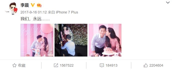 李晨求婚公布微博,也是在“我們”后面,加了“永遠”。