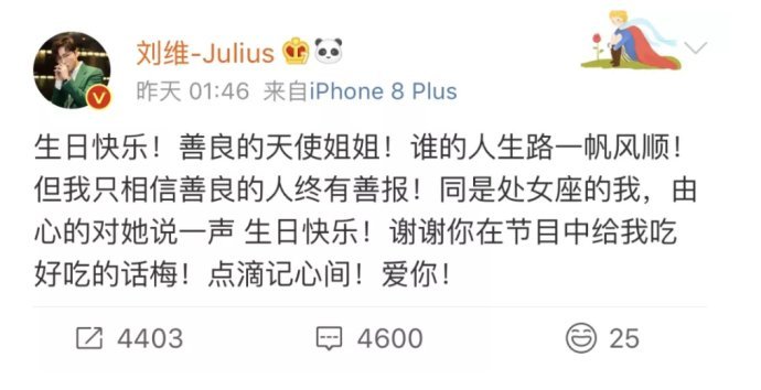 但一夜之間娛樂圈人脈凋殘至此,只剩一個多年合作的導演,一個照道理應該是撕破臉才對的前經紀人,以及一個不怎么熟的藝人送上生日祝福,還是難免讓人感到世事涼薄。