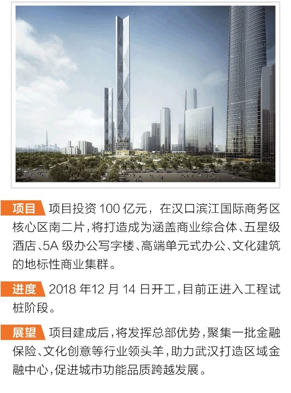 項目選址漢口濱江國際商務區核心區南二片,于2018年12月14日開工,目前正在進入工程試樁階段。這里將打造成為涵蓋商業綜合體、五星級酒店、5A級辦公寫字樓、高端單元式辦公、文化建筑的地標性商業集群,其中包括兩棟超高層商務辦公大樓。