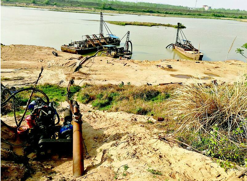 除直接盜采外,他們還從采砂船上鋪設管道,沿河堤中部穿堤而過,最后連入河中進行瘋狂盜采。7個月時間里,舉水河河床上被挖出了大大小小的深坑,水流經過便形成漩渦,很容易發生意外。