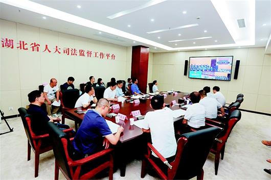 省人大內務司法委員會組成人員運用省人大司法監督工作平臺集中察看庭審。