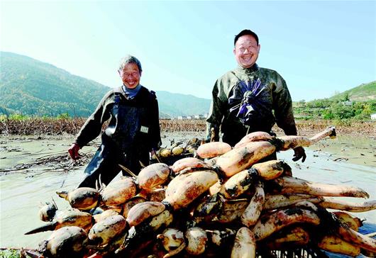 圖為:保康縣寺坪鎮崗子村農民喜挖蓮藕。(視界網 陳泉霖 攝)