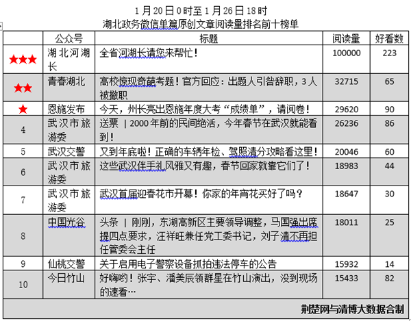 單篇原創(chuàng)文章排名方面,“湖北河湖長(zhǎng)”成為“黑馬”,奪得第1名;“青春湖北”奪得第2名;“恩施發(fā)布”奪得第3名。