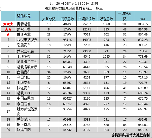 荊楚網(wǎng)客戶端—荊楚網(wǎng)消息(記者 石倩)2019年1月28日,由楚天輿情數(shù)據(jù)研究院聯(lián)合清博大數(shù)據(jù)制作的湖北政務(wù)微信排行榜第220期發(fā)布。相較上周,本周總榜指數(shù)變化不大。“青春湖北”蟬聯(lián)第1名;“武漢交警”重回前三甲,奪得第2名;“健康湖北”從上期第2名下降至本期第3名。