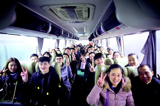 圖為:2月14日,利川市元堡鄉100多名務工者登上大巴,興高采烈前往立訊精密昆山工廠跟班實訓。(視界網孫婷婷攝)