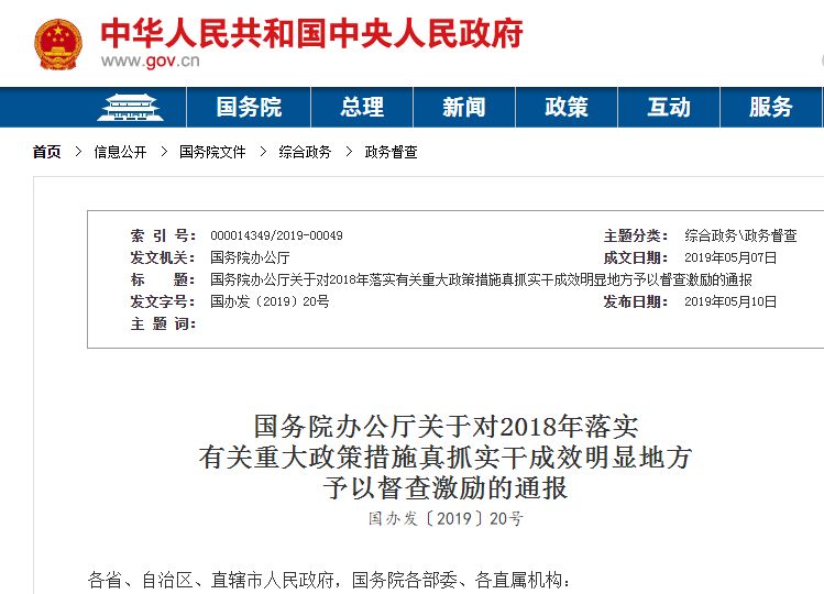 2019年對上述地方在國務院大督查實地督查中予以“免督查”。