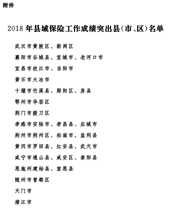 2018年,全省各地以習(xí)近平新時(shí)代中國特色社會(huì)主義思想為指導(dǎo),深入學(xué)習(xí)貫徹習(xí)近平總書記視察湖北重要講話精神,認(rèn)真落實(shí)省委、省政府決策部署,加快推進(jìn)我省現(xiàn)代保險(xiǎn)服務(wù)業(yè)改革,縣域保險(xiǎn)業(yè)發(fā)展?jié)摿M(jìn)一步釋放、活力進(jìn)一步增強(qiáng),發(fā)展環(huán)境持續(xù)改善,在服務(wù)經(jīng)濟(jì)、保障民生、精準(zhǔn)扶貧、促進(jìn)縣域社會(huì)治理創(chuàng)新等方面功能作用進(jìn)一步顯現(xiàn),保險(xiǎn)業(yè)與地方經(jīng)濟(jì)社會(huì)發(fā)展協(xié)調(diào)性不斷增強(qiáng)。為進(jìn)一步引導(dǎo)和推動(dòng)縣域保險(xiǎn)業(yè)發(fā)展,提升保險(xiǎn)業(yè)服務(wù)縣域經(jīng)濟(jì)社會(huì)發(fā)展能力,省人民政府決定,對(duì)2018年縣域保險(xiǎn)工作成績突出的武漢市黃陂區(qū)等30個(gè)縣(市、區(qū))予以通報(bào)(名單附后)。