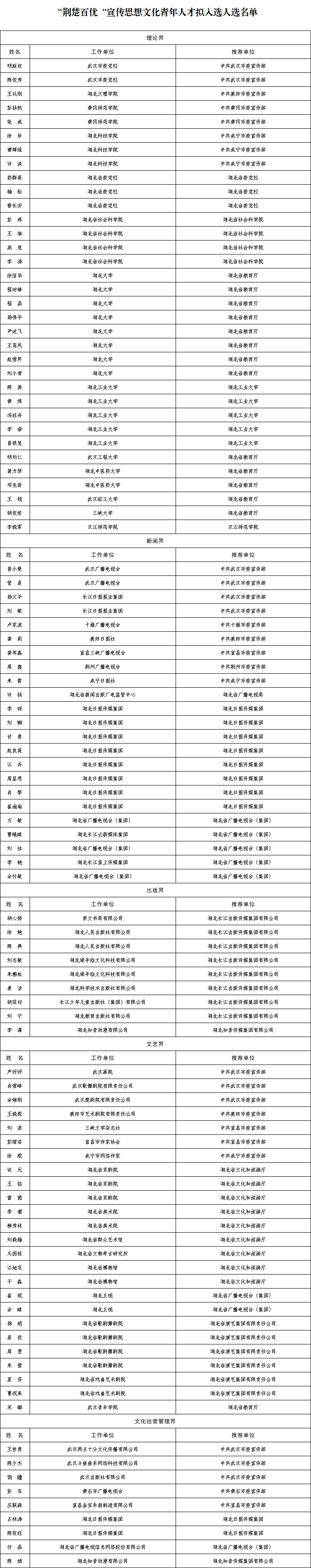 根據(jù)省委宣傳部、省委網(wǎng)信辦、省文化和旅游廳、省廣播電視局《關(guān)于“荊楚百優(yōu)”宣傳思想文化青年人才選拔培養(yǎng)工作的實(shí)施意見(jiàn)》精神,經(jīng)推薦申報(bào)、資格審核、專家評(píng)審、綜合評(píng)議、會(huì)議研究等程序,確定了100名擬入選人選,現(xiàn)予以公示。