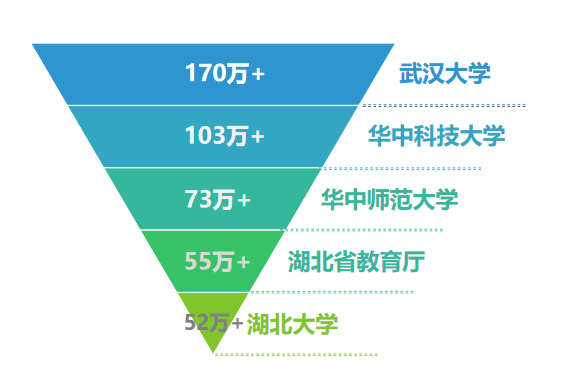 從文章閱讀總量來看,本期TOP10微信公眾號文章閱讀總量與WCI得分趨勢保持一致,中下部賬號閱讀總量提升明顯,除首位“武漢大學”基本保持不變外,2至5名較上期同名次均增長20W左右。在賬號分布上,閱讀量前五名與WCI總體得分排名情況相同。